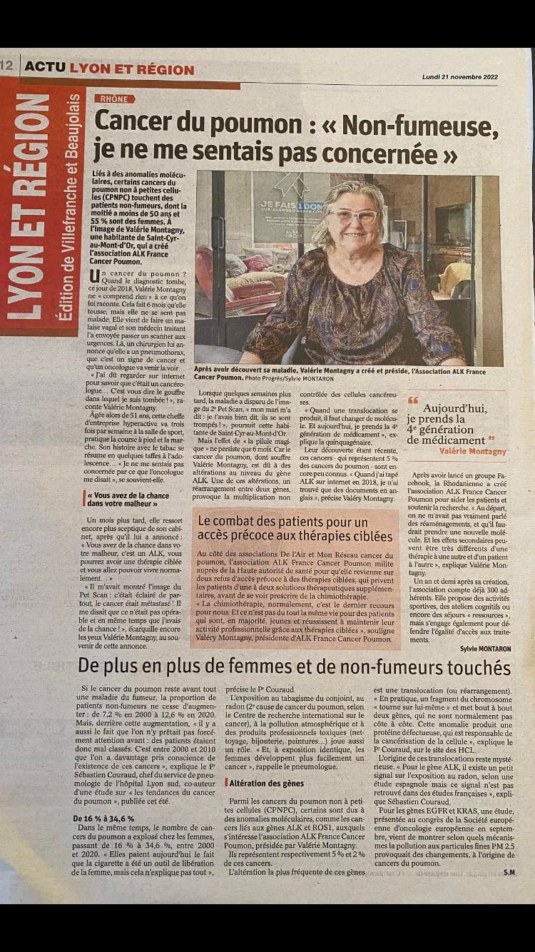 Faire connaitre la maladie et l’association pendant ce mois de sensibilisation aux cancers du poumon, Novembre Perle 2022. Aujourd’hui dans Le Progrès de Lyon, témoignage de Valérie, patiente depuis 2018, et présidente de l’association.